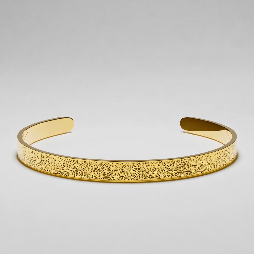 آية الكرسي منقوشة بدقة على سوار ذهبي أنيق، تحمله وتحس إنك محاط بحفظ الله في كل مكان تروح. تفصيل ما يمر عليه أحد بدون ما يوقفك ويسألك عنه